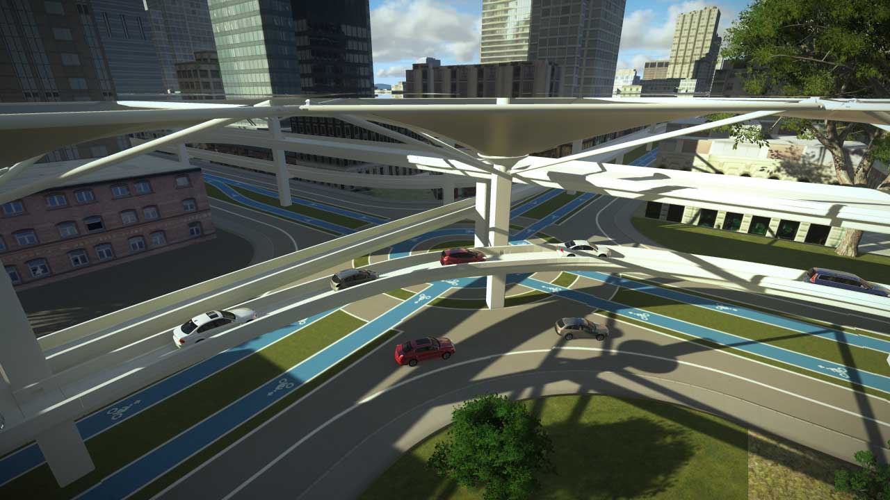 All over the world there is a strong urban growth. It is expected, that the urban population will be double in the next 50 years. It is obvious that the development of the urban traffic will become worst. In order to prevent this scenario, there are big efforts to shift at least a part of the individual transport off the roads by various Personal Rapid Transit Systems (PRT). In the field of public transport there is a trend from undergrounds to the cheaper Automated People Mover systems, which mainly have elevated tracks. However, all rail-guided technologies don’t have enough flexibility to overcome the urban traffic problem in a comprehensive manner.