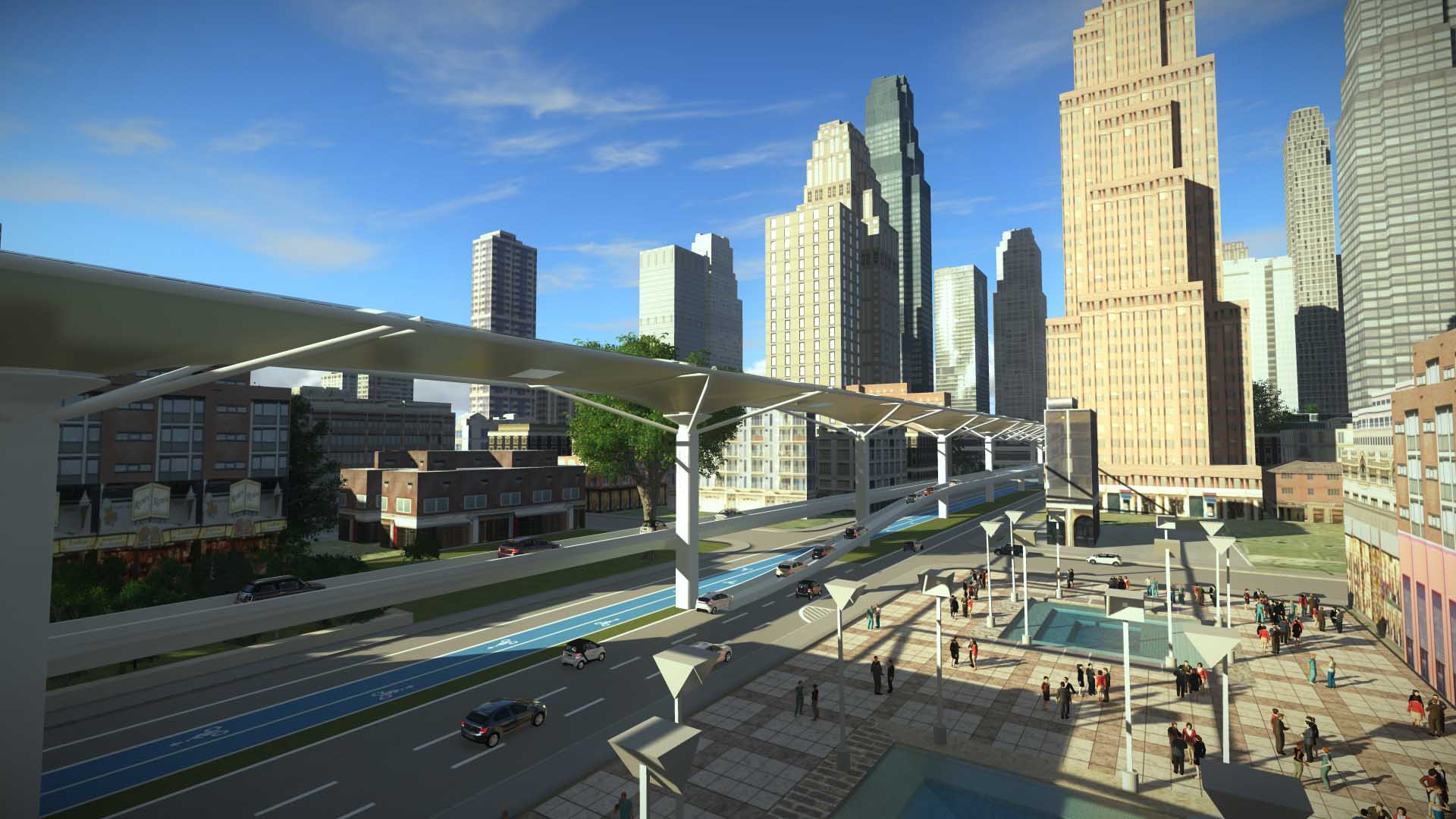 All over the world there is a strong urban growth. It is expected, that the urban population will be double in the next 50 years. It is obvious that the development of the urban traffic will become worst. In order to prevent this scenario, there are big efforts to shift at least a part of the individual transport off the roads by various Personal Rapid Transit Systems (PRT). In the field of public transport there is a trend from undergrounds to the cheaper Automated People Mover systems, which mainly have elevated tracks. However, all rail-guided technologies don’t have enough flexibility to overcome the urban traffic problem in a comprehensive manner.