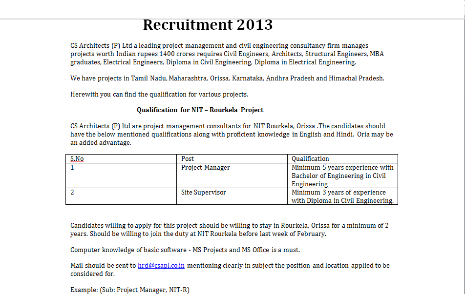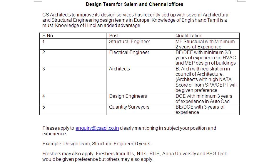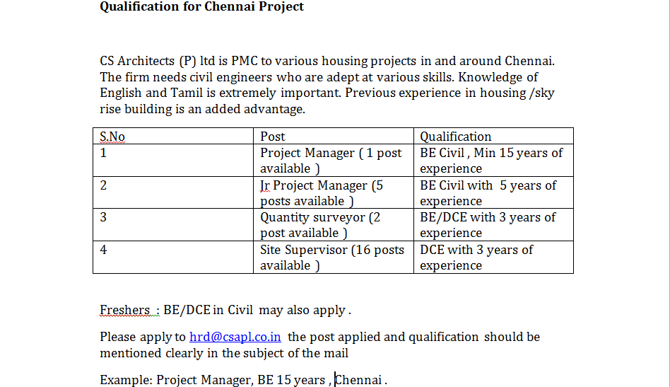 Recruitment of Engineers For residential / skyscrapers at Chennai