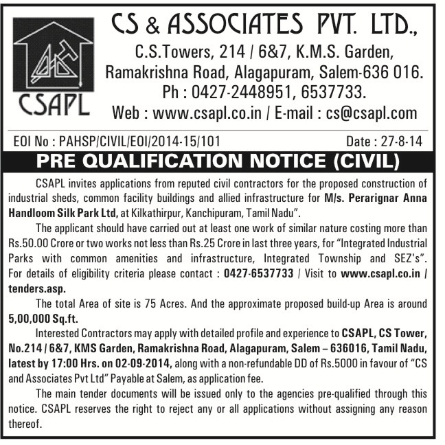 Pre Qualification Notice (Civil) for Perarignar Anna Handloom Silk Park, Kanchipuram